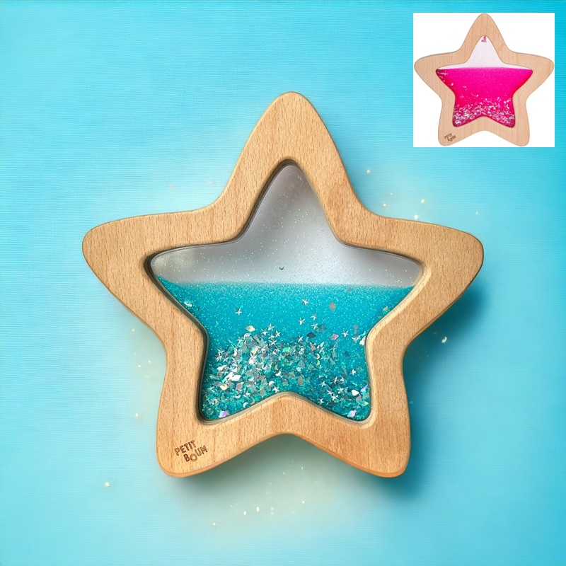 Wyjątkowo duża, bo aż 19 cm gwiazda została stworzona ręcznie w Hiszpanii. Całość wykończono starannie wyszlifowanym drewnem, co nie tylko zwiększa walory estetyczne produktu i pozytywnie wpływa na trwałość zabawki, ale także sprawia, że produkt jest niezwykle przyjemny w dotyku. Gwiazda przepływowa to piękna mieszanka brokatu i piasku fluorescencyjnego, które połyskują w połączeniu ze światłem. Spróbuj naświetlić gwiazdę, a odkryjesz niewidoczne wcześniej gwiazdki fluorescencyjne wirujące w brokatowym płynie. To zdecydowanie efekt WOW, który zachwyci dzieci i rodziców!